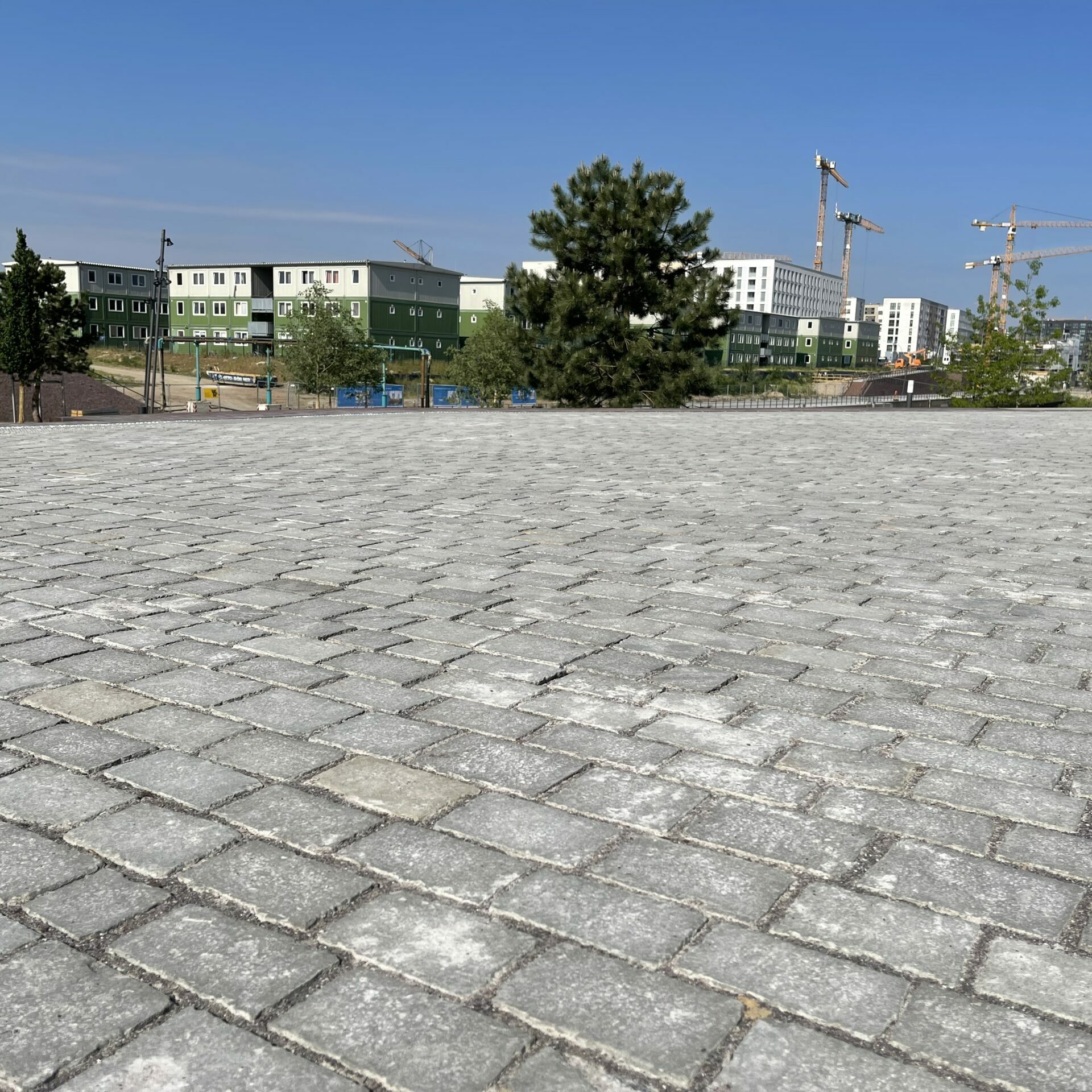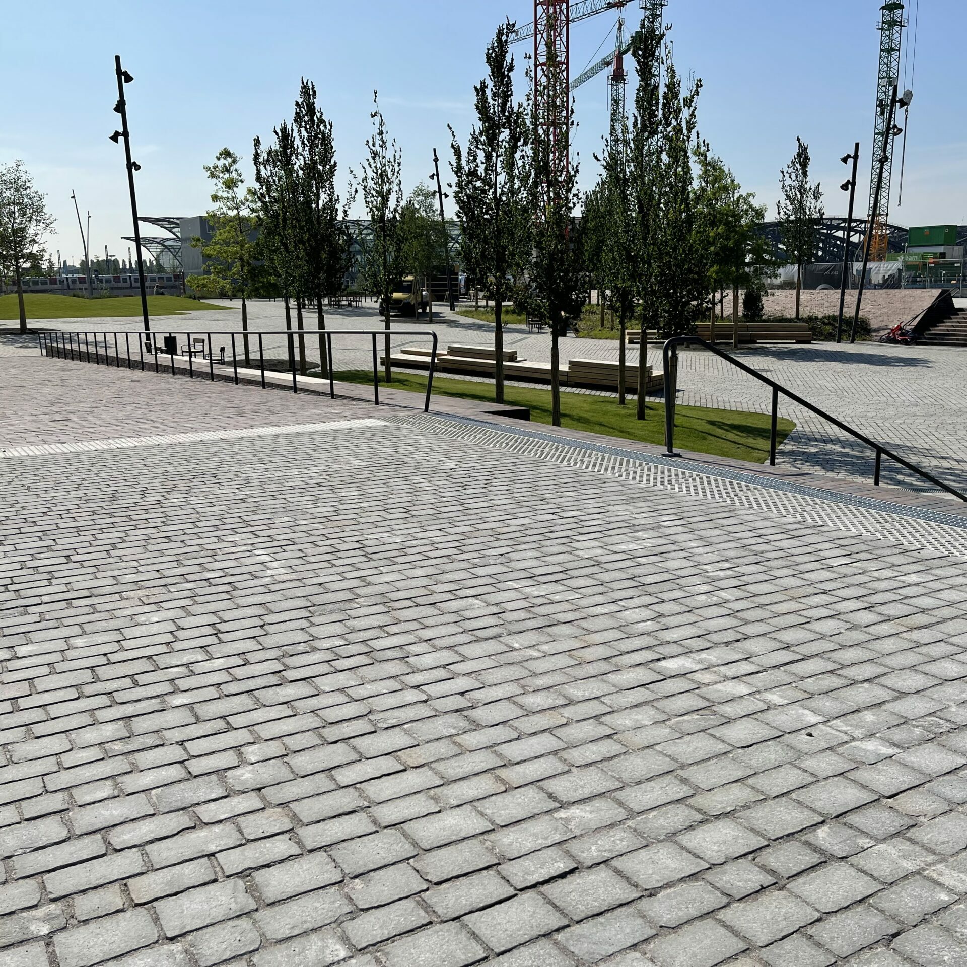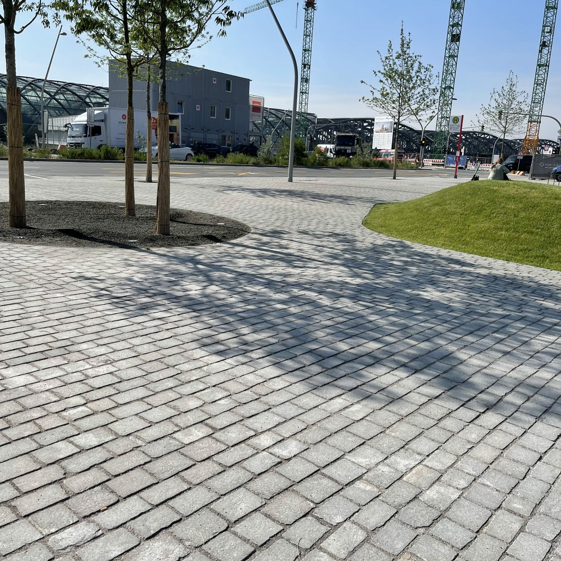 Für dieses Projekt haben wir Reihenpflaster sowie taktile Bodenplatten aus Grauwacke und Granit geliefert. Die Grauwacke zeichnet sich durch ihr einzigartiges grau-grün-braunes Farbspiel aus, dass dem Platz eine besondere Ästhetik verleiht. Um die Gesamtfläche optisch ansprechend und abwechslungsreich zu gestalten, wurden drei Steinbreiten in unterschiedlichen freien Längen verwendet. Diese Variation sorgt für eine dynamische und lebendige Platzgestaltung.
