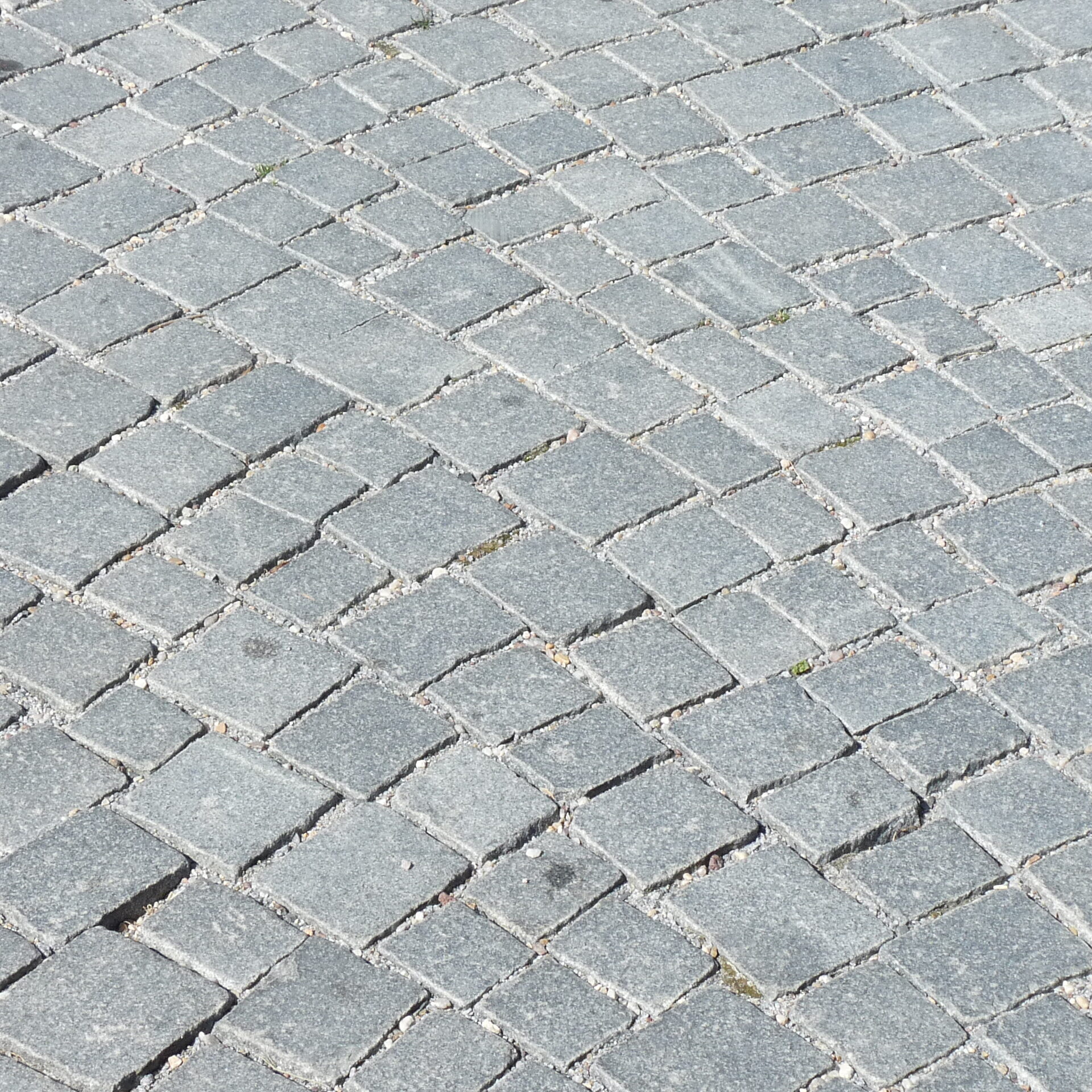 170 qm Kleinpflaster aus Quarz-Monzodiorit mit gesägter und gestockter Oberseite