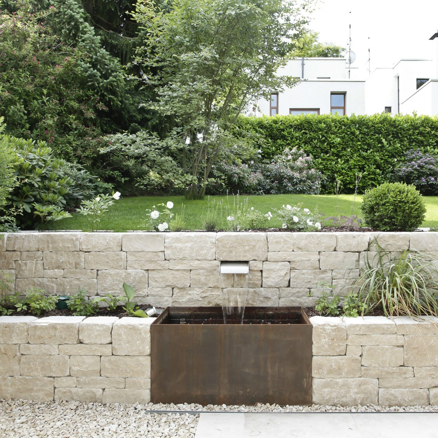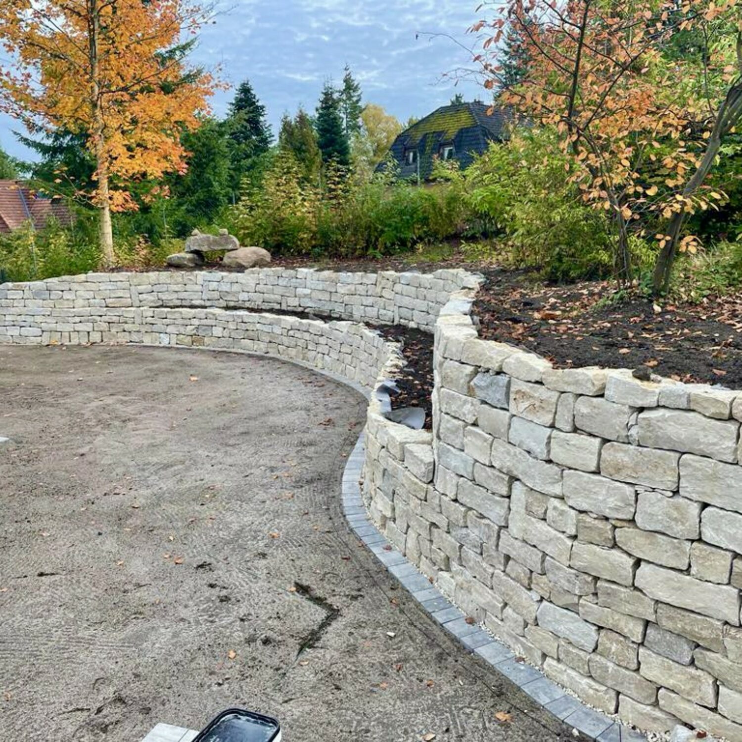 Durch die Verwendung verschiedener Schichthöhen lassen sich vielfältige Optiken und Mauerwerksverbände realisieren – von modern und schlicht bis verspielt. Die hochwertige Bearbeitung sorgt für eine gleichmäßige, stabile und langlebige Mauer, ideal für Hochbeete, Stützmauern und weitere gestalerische Projekte im Gartenbau.